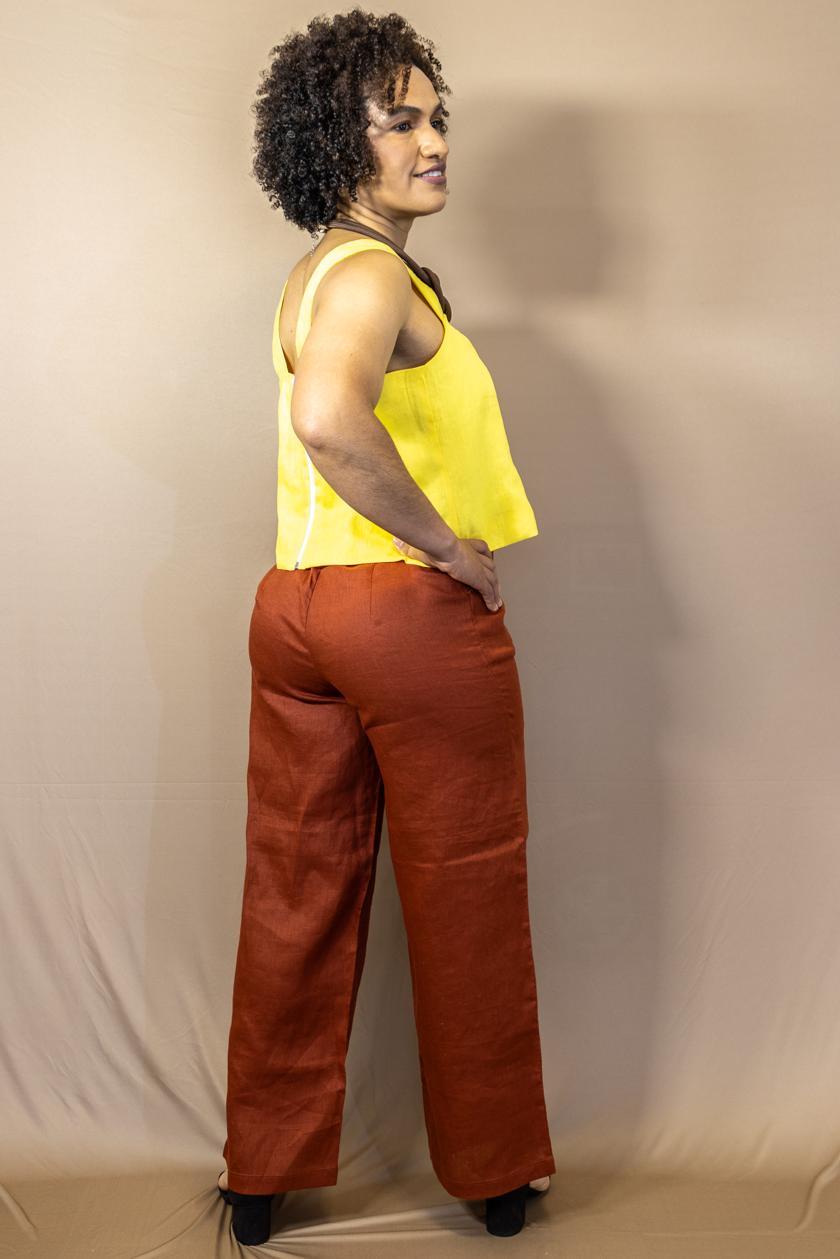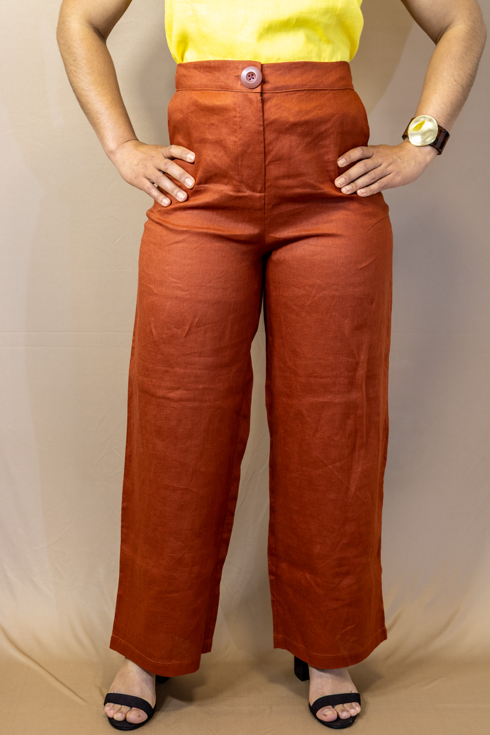 Confeccionado em 100% linho a Calça Abidemi possui corte reto, bolso faca, fechamento com botão simples e zíper na cor Terracota.