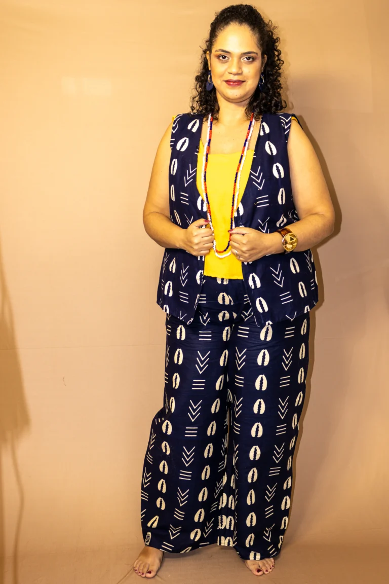Calça Pantalona com estampa africana de búzios, possui bolsos faca e fechamento de botão e zíper.